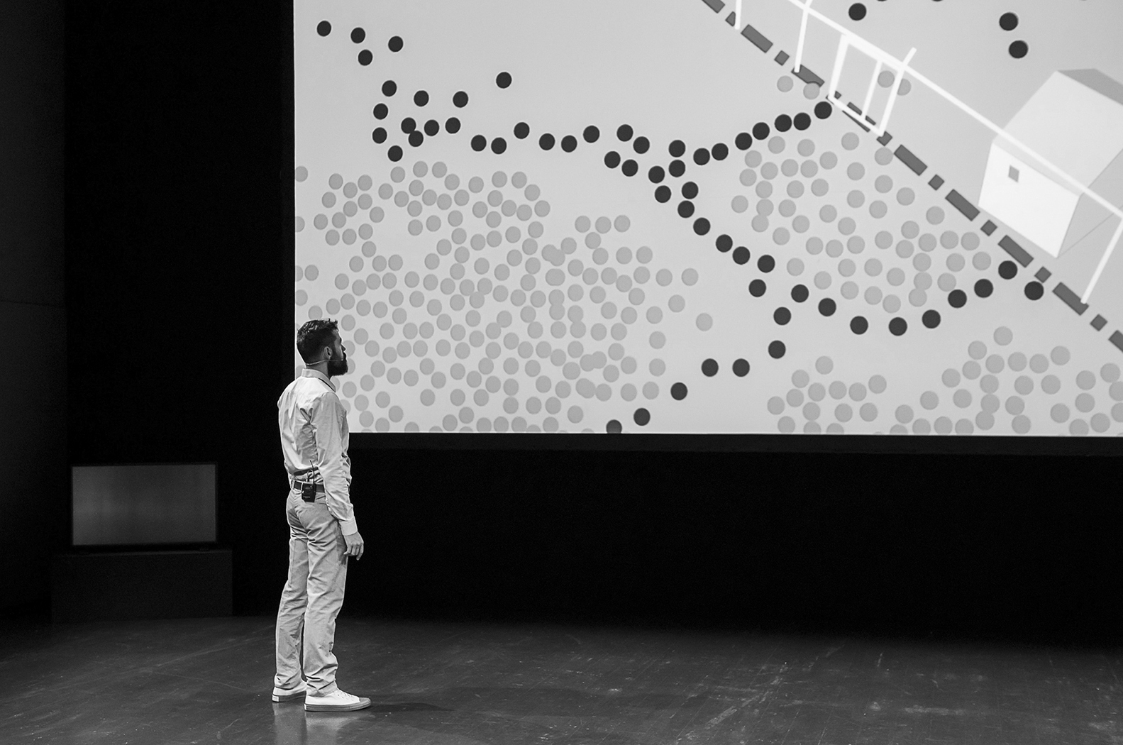 In 2010 Arkadi Zaides initiated a collaboration with photographer Yuval Tebol and multidisciplinary artist Daniel Landau to create the scenography for the stage performance ‘Land-Research’. On a large screen set at the back of the stage, images shot by Tebol with a panoramic camera in various locations in Israel/Palestine were altered by Landau’s graphic interventions. These minimalist black and white landscapes served as buffers between the solos of five performers enacted on stage. In 2015 the same methodology was repeated following an invitation by scenographer Jozef Wouters and his Decoratelier for the creation of the INFINI project. This time, a landscape, an altered image captured at the Turkish-Greek border, stood on the bare stage, it was created along with 15 other scenographies by 15 different artists that performed on the stage of the KVS theatre in Brussels. INFINI#1 GAZA ENVELOPE In ‘INFINI#1 GAZA ENVELOPE’ an image shot by Yuval Tebol in 2008 captures a segment of the border between Israel and the Gaza Strip. It is a shot of a stockpile of security barriers used by the Israeli security forces to barricade civilian targets. The Israeli disengagement from the occupied Gaza Strip took place in 2005. In 2007, after Hamas took control of the strip, an ongoing land, air, and sea blockade was imposed on the citizens of Gaza both by Israel and Egypt. Since then Israel has de facto controlled all aspects of life in Gaza and operations are conducted repeatedly by the Israeli army, killing thousands of Palestinians. Hamas, in return, periodically attempts to launch missiles towards Israeli settlements. The sky in Tebol's panoramic image is gradually cut out by Landau’s digital intervention, leaving the barriers, blocks of bare concrete, alone in the panoramic frame. The INFINI#1 GAZA ENVELOPE video installation therefore uses the edited picture as a visual metonymy for the lethal dynamics shaping the experience of the Israeli-Palestinian border. This process provides a visual reflective meditation on the deadly barrier separating the two peoples. INFINI #1 LESVOS In ‘INFINI #1 LESVOS’ Tebol, Landau and Zaides documented a definite section of the European border, the coastline of the Mantamados region of Lesbos, which is the Greek island’s closest point to Turkey. In 2015, each day, approximately 1,500 migrants entered Europe through this location. The video work provides a contemplative gaze on one of the three main gateways to fortress Europe. The image of the coastline (photographed by Tebol) is fundamentally transformed (by Landau) with the use of digital effects: fragments are cut out, isolated, and framed. The distant Turkish coastline as well as the rubber dinghies previously used to carry migrants and now left on the Greek shore are delineated with a yellow dotted line and blacked out. The sea and the air have also been edited extensively. This process takes place silently, detachedly: as if the tragedies unfolding on the coast were nothing more than a problem that can be solved with the aid of digital technology.